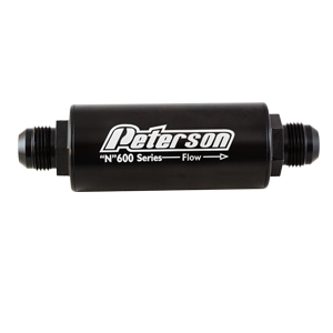 Peterson's 600 series filter features our same quality filter in a smaller package for fuel systems. Billet aluminum construction, anodizing and a stainless screen element assure durability and compatibility with most fluids. These filters also have the option of an integral ball valve in the inlet cap. Available in 45, 60 or 100 inless steel elements or 1 10/20 micron cellulose element. End caps are available in -4 through -12 AN.